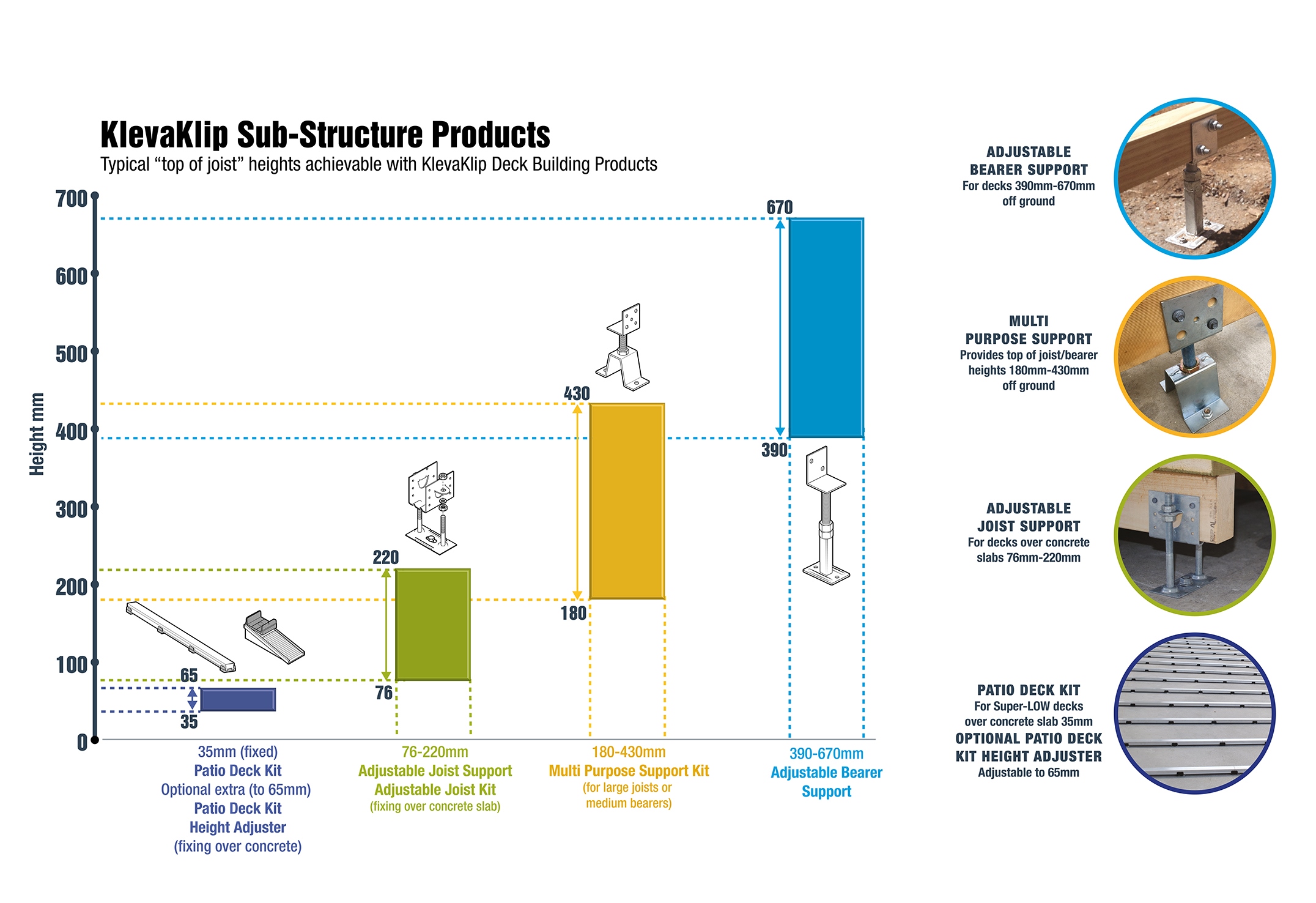 Note– the above information is a “practical” rather than an “absolute” document. There will be a number of ways to achieve the heights mentioned with different sized bearers and joists, however the installer should always be mindful to operate within the KlevaKlip product parameters and relevant joist/bearer span tables.
