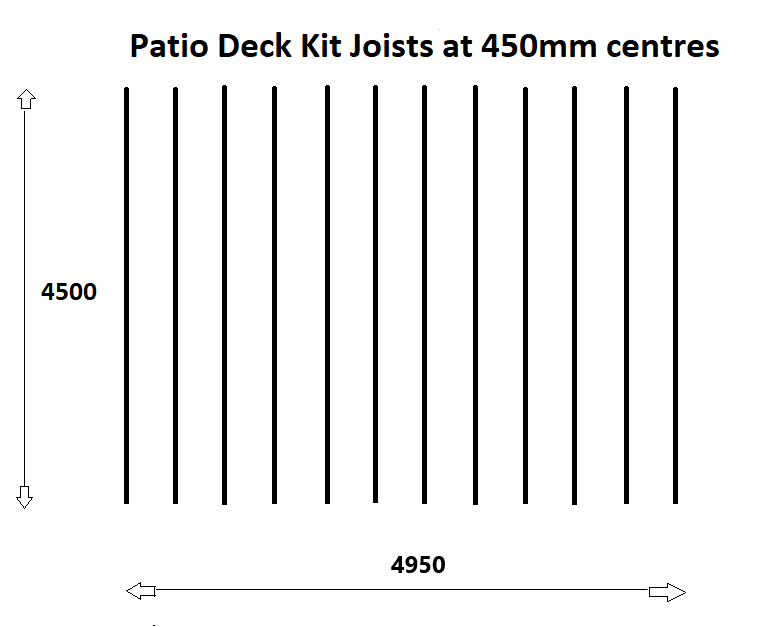 IN THIS EXAMPLE YOU HAVE 12 ALUMINIUM JOISTS @ 4.5 metres long = 54 metres. EVERY BOX OF PATIO DECK KIT CONTAINS 9 x 1 meter Length ALUMINIUM JOISTS